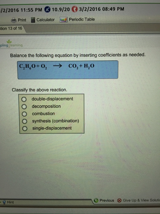 This chemistry video tutorial explains how to classify different types of chemical. Transcribed image text from this question. H2 + cl2 2hcl synthesis ca + 2h2o ca(oh)2 + h2 single displacement practice 2co + o2 2co2 synthesis 2kclo3 2kcl + 3o2 decomposition practice ch3sh + 3o2 co2 + 2h2o + so2 combustion zn + 2hcl zncl2 + h2 single replacement predicting the outcomes of chemical reactions predicting single. Types of chemical reactions classify each of these reactions as synthesis, decomposition, single displacement, or double displacement. Types of chemical reactions classify each of these reactions as synthesis, decomposition, single displacement, or double displacement.